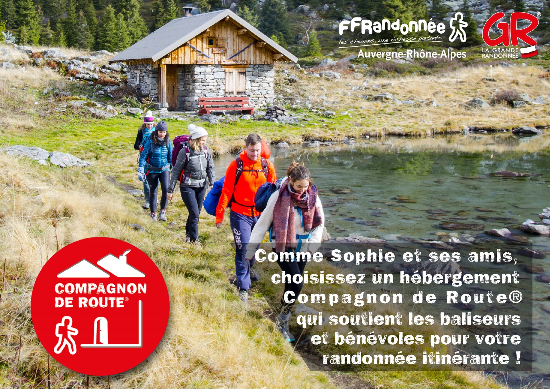 Compagnon de route® est un programme de partenariat avec les hébergeurs afin d’aider à financer les actions des comités départementaux de la FFRandonnée sur les sentiers qu’ils ont homologué GR® ou GR® de Pays (gestion, promotion, entretien et contrôle). Créé par la FFRandonnée Haute-Loire, ce partenariat s’étend progressivement à tout le grand sud-est de la France. Tous les comités ont désormais chaque année un logo et un autocollant commun.